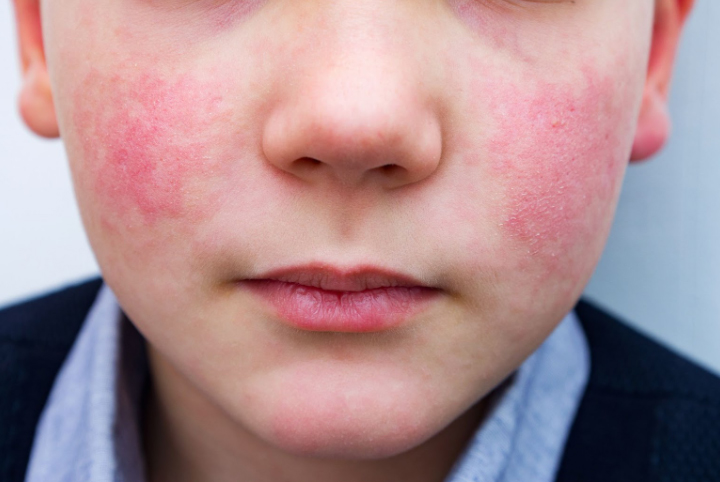 Эта сыпь является визитной карточкой заболевания: яркое покраснение щек с бледностью вокруг рта — тот самый «синдром нашлепанных щек». Нередко она становится единственным проявлением болезни. Даже если что-то ранее беспокоило, к моменту появления сыпи самочувствие улучшается, а вирус исчезает из крови. Сохраняется сыпь около 4–5 дней. Родители нередко сравнивают ее с фото парвовирусной инфекции у детей, чтобы убедиться в диагнозе.